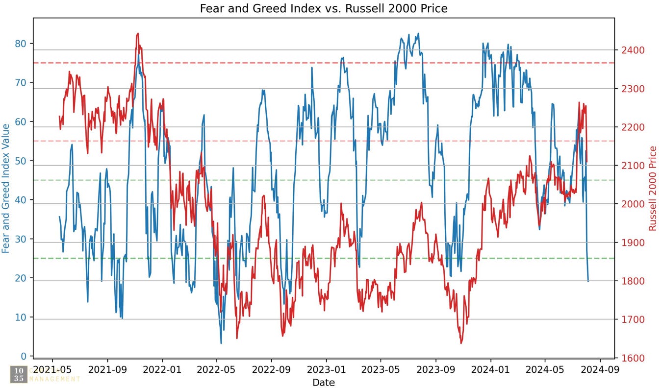 Finally, we review two key sentiment indicators—the AAII Sentiment Survey and the CNN Fear & Greed Index—both plotted against the Russell 2000 index.